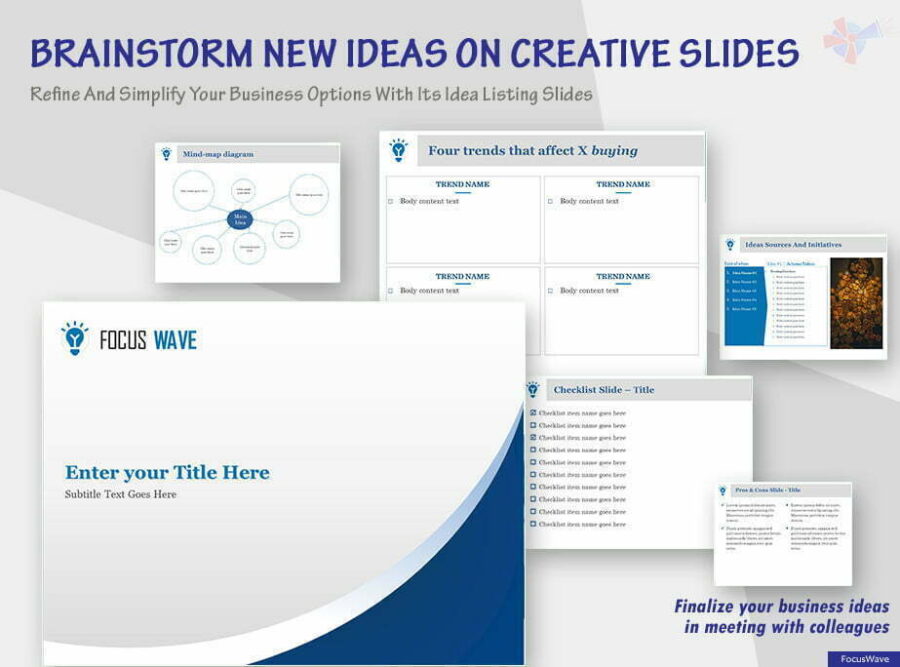 Let’s brainstorm a list of new business ideas and present them in your meetings with FocusWave PPT.