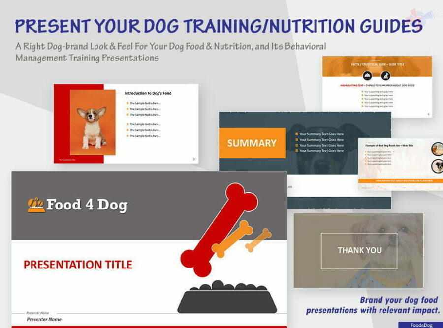 Being a dog trainer, you have to educate pet owners on how to take care of their dogs. This template offers a branded dog presentation look. Use this template to convey the importance of dog nutrition and its food.