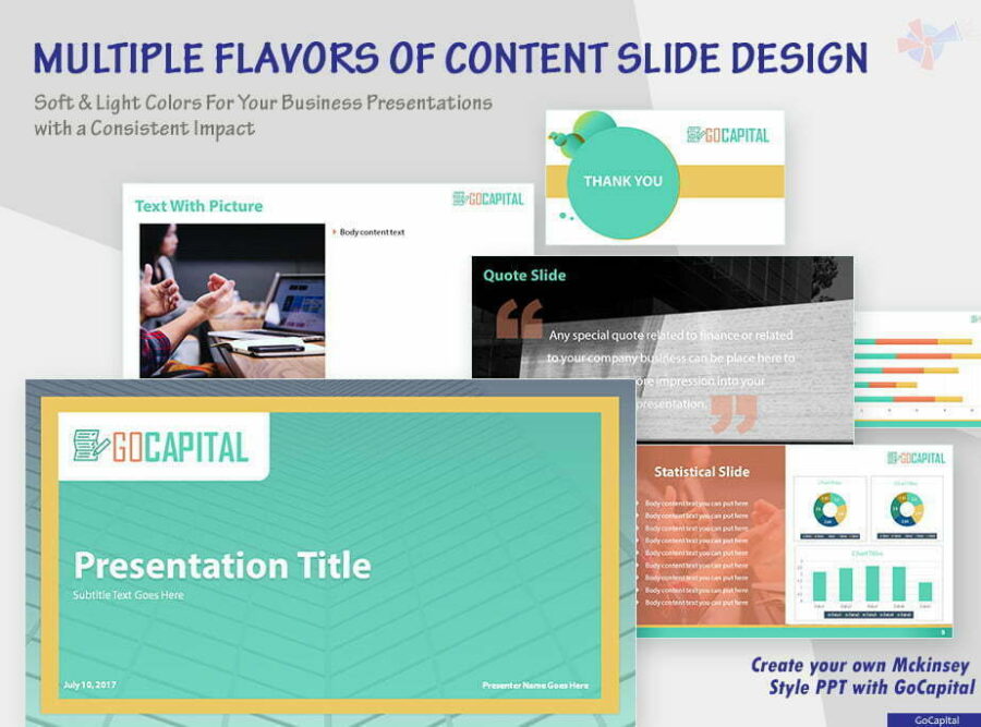 GoCapital, a well-design a corporate PowerPoint template with collection of 20+ slides to give you control to have multiple flavors content design or arrangements on slides while keeping the consistency intact. This template gives you consistency in terms of brand color, design and fonts, as well as alignments of contents. It can be formatted to mckinsey style presentations.