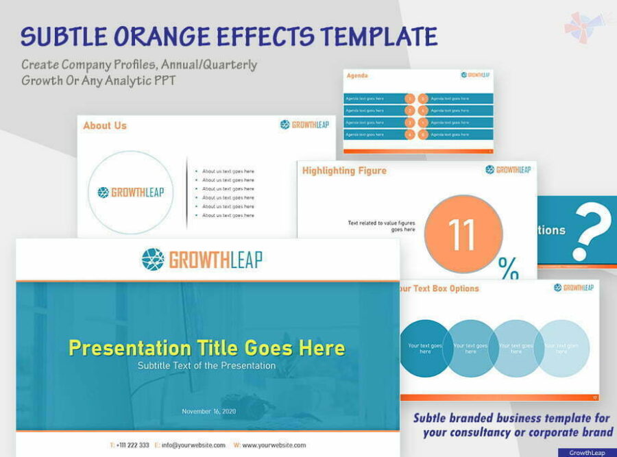 GrowLeap is yet another business PowerPoint template with teal, yellow and orange colors to create a subtle effect in your presentations