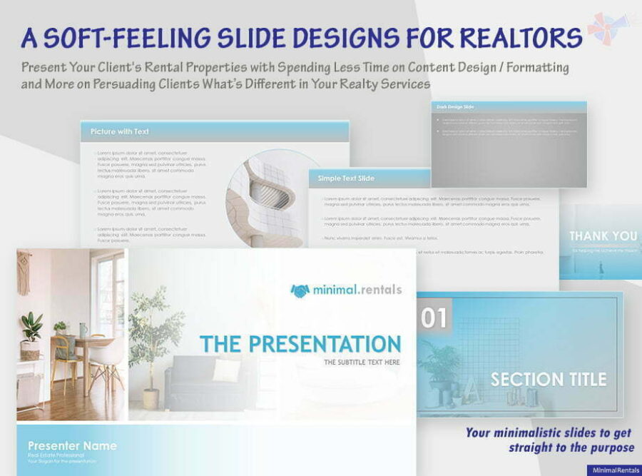 If you’re looking for a soft-looking presentation template that’s minimalistic, straight to the purpose then try MinimalRentals. Realto can use its slides to offer homeowner guideboook presentation or your services. Or present your client’s rental properties, best buy offers, or even before/after home renovation.