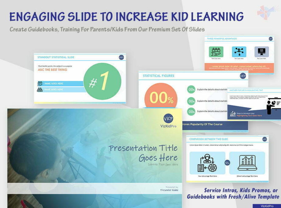 If you’re an expert teaching children’s and their parent building a next generation of confidence and growing kids. Then best thing you can do is inspire them with your work and trainings presentations using our VizKidPro PowerPoint Template. It’s a premium set of slide of from VizInspire to create alive & healthy outlook of your presentation.